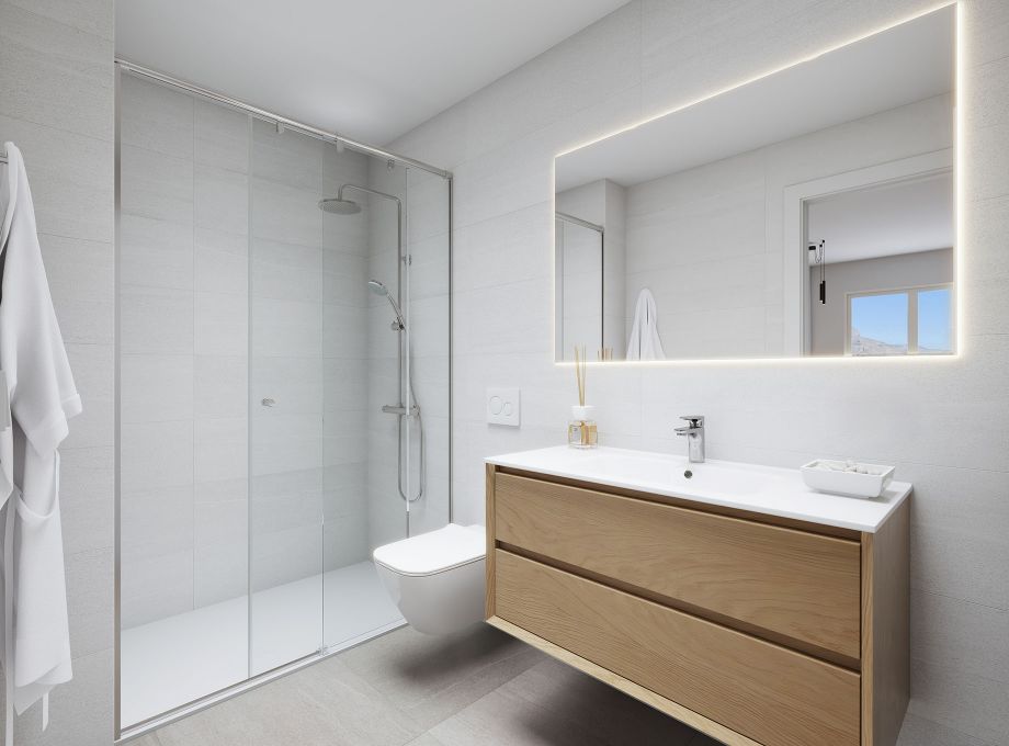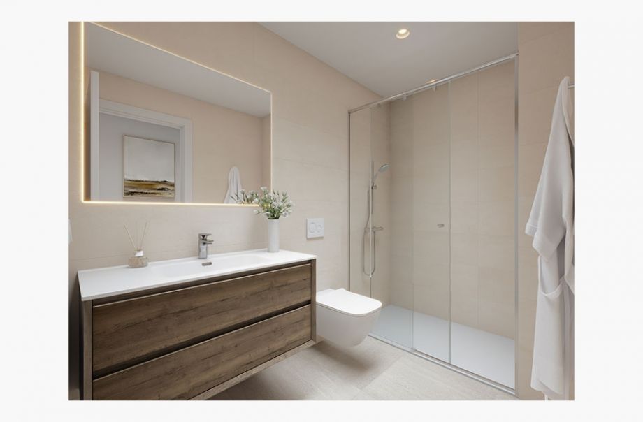 Los cuartos de baño han sido diseñados como espacios de bienestar, donde la funcionalidad se combina con una estética contemporánea y materiales de alta calidad. Cada baño transmite una sensación de equilibrio y confort, con un cuidado diseño que prioriza la amplitud visual, la luminosidad y la durabilidad.